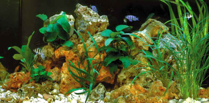Für den Bodengrund wird feiner Sand oder Kies benötigt. Mann kann auch erst eine Kiesschicht ins Becken geben und dann mittelgroße Kiesel verwenden. Von ganz weißem Bodengrund rate ich ab da er die schönen Farben der Cichliden nicht unterstützt. Der Sand oder Kies sollte mit buntem Kies gemischt werden, welcher im Fachhandel problemlos zu erwerben ist. Sofern Kies verwendet wird erfreuen sich die grabfreudigen Chichliden an rundem nicht scharfkantigem Bodengrund. Der Kies sollte eine maximale Körnung von 3 bis 5mm haben, grober Kies lässt viel Mulm durch und der Bodengrund verschmutzt sehr schnell und muss oft mit der Mulmglocke gereinigt werden. Die sonst verwendeten Pflanzennährböden haben dei Cichliden den Nachteil das sie sehr schnell wieder ausgegraben werden und liegen dann an der Oberfläche des Sandes, wo die Pflanzen keinen Nutzen mehr davon haben. Der boden sollte eine Höhe von 7 bis 10 cm erreichen, wenn dann später einmal ein Stein ins Rollen geraten sollte, ist die Aquarienbodenscheibe geschützt. Sand und Kies werden vor Gebrauch gründlich mit kaltem Wasser ausgespült. Als letzter Säuberungsgang sollte man den Kies und alle anderen Steine auskochen damit keine Bakterien in das Aquarium gelangen. Nachdem der Bodengrund eingebracht ist können wir eigentlich mit der Dekoration beginnen. Als erstes sollte man sich Gedanken über eine Rückwand machen. Welche ist empfehlenswert. Es gibt mehrere Varianten zum einen kann man die Fotorückwände aus dem Handel verwenden oder man baut sich eine Rückwand selber was aber meistens in die Hose geht. Die dritte Variante ist das man eine Strukturrückwand z.B. Back to Nature kauft die aber für große Aquarien sehr teuer ist. 130m ca. 800DM. Für die weitere Einrichtung benötigen wir vor allem Steine, da die Malawiseebarsche im Felsitoral oder der Übergangszone leben, benötigen wir auch eine dementsprechende Dekoration im Aquarium. Große Steine oder Felsblöcke wirken im Aquarium dekorativer als kleine Aufbauten. Je nach Größe des Aquariums können mehrere Steintürme bis zur Wasseroberfläche reichen. Diese Türme stellen dann die Reviergrenzen dar. Beim Aufschichten der Steine muss darauf geachtet werden das herabfallende Steine die Bodenscheibe nicht zerstören können. Weiterhin ist darauf zu achten das die Steine die Seitenscheiben nicht berühren was die Klebverbindung stark beanspruchet. Nachdem wir die Steindekoration behandelt haben kommen wir nun zur Pflanzendekoration. Im normalen Lebensraum kommen nur sehr wenige oder gar keine Pflanzen vor. Im Aquarium sind die Pflanzen aber unabkömmlich, da sie zum Schadstoffabbau beitragen. Es kommen aber nicht alle Pflanzen für ein Malawiseecichlidenbecken in Frage da sie zum ersten zur Wasserhärte und zweiten zu den etwas robusten Fischen passen müssen. Im Kapitel Pflanzen findet ihr die besten Pflanzen für ein Malawiseebecken. Diese aufgelisteten Sind aus meiner Erfahrung sehr robust und können ohne weiteres gepflegt werden.